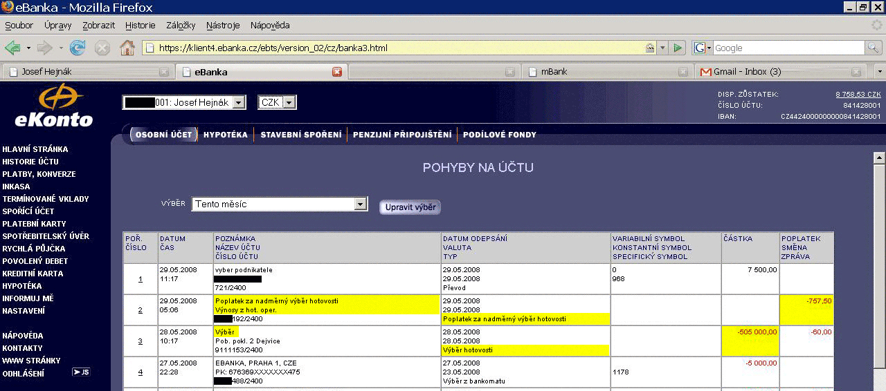 V rozporu s reklamami, které eBanka zveřejňuje, poplatky účtuje. I za takové nesmysly, jako je "nadměrný" hotovostní výběr. "Já jsem si ze svého účtu vybral mých 505 tisíc v hotovosti a nahlásil jsem to včas dopředu. A oni mi sebrali mých 757 Kč za takzvaný "nadměrný výběr"," konstatuje čtenář Josef Hejnák. A své zjištění dokládá výpisem ze svého účtu. |