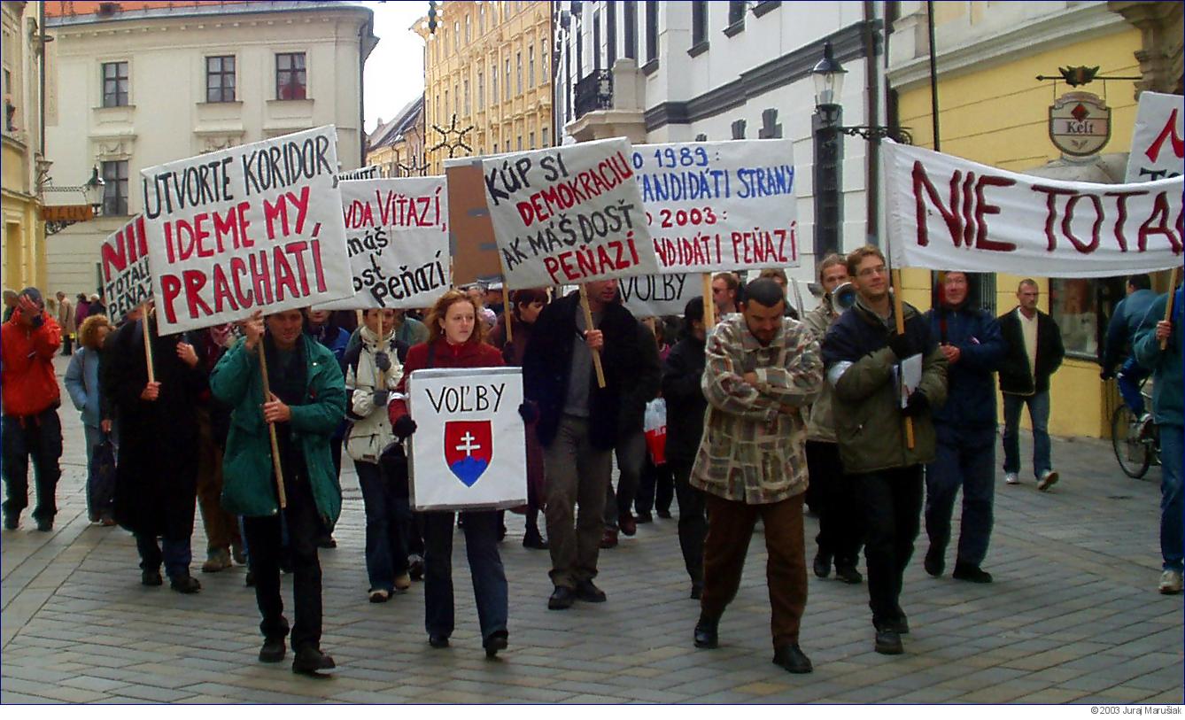 Zároveň by podľa tejto novely mali vzniknúť štyri, resp. osem volebných krajov. V každom z nich bude musieť strana, uchádzajúca sa o priazeň voličov, zaplatiť kauciu pol milióna korún. Ak teda nejaká strana bude chcieť kandidovať na celom území Slovenska, bude musieť ešte pred voľbami zložiť dva, resp. štyri milióny korún. Je samozrejmé, že ak bude spomínaná novela prijatá, bude z volebnej súťaže vyradená väčšina subjektov, ktoré si jednoducho nebudú môcť dovoliť do kampane vstúpiť. Novela zákona priamo vylučuje z politického zápasu chudobné strany a predovšetkým politické sily, ktoré nemajú za sebou bohatých sponzorov. Hoci práve slobodné voľby boli hlavnou požiadavkou demonštrantov v novembri 1989, novela zákona, ktorú pripravila vládna koalícia štyroch pravicových strán, fakticky zbavuje volebného práva veľkú časť občanov. Mimochodom práve tieto strany samy seba označujú za azda jediných dedičov "nežnej revolúcie." Nesúhlas s vytváraním občanov druhej kategórie, pozbavených možnosti reálne využívať základné demokratické právo, akým volebné právo nepochybne je, bolo príčinou protestnej demonštrácie, ktorej organizátorom boli Združenie sociálnej sebaobrany a Mladí sociálni demokrati. Protest proti vytváraniu oligarchického systému na Slovensku podporilo, podobne ako v predvečer novembra 1989, niekoľko desiatok mladých ľudí. Spomedzi politikov bolo medzi účastníkmi vidieť iba predsedu Sociálnodemokratickej alternatívy Milana Ftáčnika. Ostatné politické strany k otázke volebných kaucií zatiaľ mlčia. Účastníci sa zhromaždili na Hlavnom námestí, odkiaľ sa po vystúpení občianskeho aktivistu Eduarda Chmelára a predstaviteľa Združenia sociálnej sebaobrany Michala Poláka presunuli na námestie SNP, kde občania požadovali slobodné voľby pred štrnástimi rokmi. Na záver mítingu prijali výzvu, adresovanú predstaviteľom vlády, v ktorom návrh zákona označili za "najvážnejší zásah do občianskych a politických slobôd od roku 1989." Podpísalo sa pod ňu približne 60 ľudí. O tom, ako bratislavské úrady chápu demokraciu, vypovedá aj fakt, že hoci zhromaždenie a pochod boli na Miestny úrad Bratislava -- Staré Mesto riadne nahlásené v súlade so zákonom, Miestny úrad kládol organizátorom podmienky, ktoré nemali právnu oporu a napokon demonštráciu oficiálne zakázal pod zámienkou ochrany práv ostatných účastníkov cestnej premávky. Rozhodnutie mestskej časti zvrátil až rozsudok súdu, kam sa organizátori odvolali. Iniciátori sporného návrhu zákona sa netajili tým, že ich cieľom je "očistiť" politickú scénu, resp. zredukovať počet strán, kandidujúcich vo voľbách. Nie je náhodou, že slovo "očista" mali vo svojom slovníku všetky totalitné sily na Slovensku, počnúc fašistickými ľudákmi a končiac komunistami. Viacerí politológovia a sociológovia, z ktorých niektorí patrili k účastníkom Novembra 1989, však v súkromných rozhovoroch vládu obhajovali slovami, že nemajetní občania majú možnosť angažovať sa v lokálnych voľbách alebo môžu presadiť zvolenie svojho prezidenta. Bývalý predseda Koordinačného centra Verejnosti proti násiliu (VPN) Fedor Gál však protest podporil. V e-maili, ktorý zaslal organizátorom demonštrácie, uviedol: "Politické strany by sa mali uchádzať o priazeň voličov svojimi víziami, osobnosťami, programami. Zviazať možnosť vstupu do politiky so solventnosťou kandidáta, alebo strany je nemorálne a proti slobode." Protest podporil aj bývalý koordinátor environmentálnej politiky VPN Juraj Zamkovský a predstaviteľka medzinárodného ekologického hnutia Greenpeace na Slovensku Ľubica Lacinová. V prípade, ak sa vládnej väčšine podarí oligarchickú novelu volebného zákona presadiť, bude to znamenať definitívny morálny bankrot politikov, považujúcich sa za dobre že nie jediných dedičov Novembra 1989. |