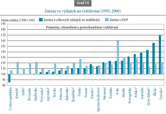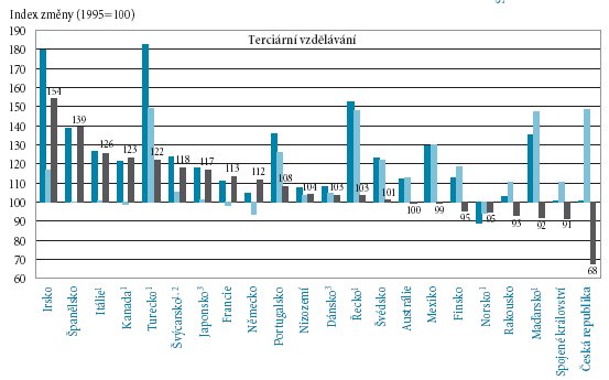 Zajímavý je také graf, který sleduje změnu výdajů na vzdělávání. V terciálním i nižším vzdělávání vede Turecko a Irsko. Tyto státy posílily školské rozpočty o 60 až 80%. Česká republika dala na nižší stupně školství o 15% méně, byla tedy jedinou zemí, ve které výdaje poklesly!