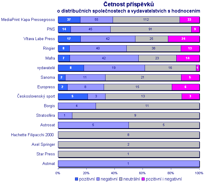 Příspěvky označené (red), (redakce), (čtk) se objevovaly zejména v denících (celostátních i regionálních). Anopress v analýze rozlišuje zkratku a celé jméno autora -- příspěvky redaktorek Martiny Vojtěchovské (Marketing & media) a Martiny Coufalové (Strategie) jsou tak s velkou pravděpodobností zachyceny i pod značkami (mav), resp. (mac). V případě agentury ČTK, která o kauze informovala od počátku a její zpravodajové zde zachyceni nejsou, byly autorkami jejích zpráv hlavně Marcela Fialková a Zuzana Opletalová (jak také ukazuje citační index této práce). Často se distribučním sporem zabýval také novinář Zdeněk Fekar (v analýze také jako "zdf") v týdeníku Euro, který se později stal šéfredaktorem Deníku Impuls Ivana Kaufmanna. Medializace účastníků sporuHlavními aktéry kauzy jsou na jedné straně distributorská společnost MPK a na druhé vydavatelé tisku, přičemž hlavní účastníci, VLP, Ringier a Mafra, jsou vlastníky První novinové společnosti (PNS). MPK a PNS se v České republice dělí o distribuci tisku. V následující tabulce je uveden přehled distribučních a vydavatelských společností s počtem, který udává, v kolika příspěvcích se o společnosti psalo. V grafu je zachycena hodnota informace o společnosti. Hodnoty jsou děleny do kategorií pozitivní, negativní, neutrální a pozitivní i negativní (příspěvek obsahoval jak kladné tak záporné informace o společnosti).