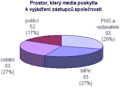 Největší prostor pro vyjádření svých názorů média poskytla Ivanu Kaufmannovi (MPK), který byl citován v 68 příspěvcích, byl s ním veden 1 rozhovor a sám byl autorem 2 příspěvků (celkem 71). Za ním následují Vladimír Poříz v VLP, který byl citován ve 26 příspěvcích a Irena Válová (Media Observatory ČR) mohla své postoje prezentovat v 25 příspěvcích. Ostatní představitelé jsou uvedeni v grafu a tabulkách.