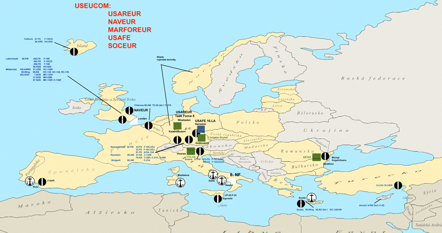 Prvky systému protiraketové obrany USA![]() Na území spojenců se vytváří adaptabilnější infrastruktura, zaměřená na zvýšení možností použití rotujících jednotek a na jejich dokonalejší připravenost a flexibilitu. Vzniká nová organizační struktura základen, představující hlavní operační základny (Main Operating Bases - MOB), jako německý Ramstein nebo španělská Rota, předsunutá operační místa (Forward Operating Sites - FOS), jako například Camp Bondsteel v Kosovu, Camp Eagle v Bosně a Hercegovině, nebo Incirlik Air Base v Turecku, nebo nově připravované základny v Bulharsku, Rumunsku, v Maroku a Tunisku a konečně místa bezpečnostní spolupráce Cooperative Security Locations (CSL), což jsou malá operační místa a zařízení dohodnutá s hostitelskými zeměmi, ze kterých by mohly v případě potřeby americké jednotky působit. Plán strategické regionální transformace (STT)![]() V době studené války se na území Evropy nacházelo 213 000 příslušníků americké armády, což představovalo ekvivalent 64 brigád. V souladu s plánem strategické regionální transformace (STT), jehož cílem je především posílit strategickou účinnost, efektivnost a operační připravenost amerických ozbrojených sil v Evropě a jejich schopnosti čelit novým bezpečnostním hrozbám, dochází zároveň k razantnímu snižování jejich počtů, a to až o dvě třetiny. Podle rozhodnutí amerického prezidenta z roku 2004 se v průběhu deseti let sníží počet vojáků USAREUR ze současných 62 000 osob, rozmístěných na 14 hlavních místech soustředění, na 24 000 vojáků ve 4 hlavních společných operačních základnách (JMOB). Kromě Wiesbadenu, který se stane místem společného velitelství USAREUR a Task Force 5 (UR&TF5) a bude schopen plnit úkoly velitelství společného úderného uskupení (JTF), půjde o Grafenwöhr, kde se spojí expediční výcvikové velitelství (ETC) s plně vyzbrojenou brigádou Stryke a modularizovanou leteckou brigádou vojskového letectva. Další JMOB bude v prostoru Kaiserslautern, kde budou soustředěny hlavní logistické základny a zdravotnické centrum. Třetím místem zůstane italská Vicenza se 173. vzdušně výsadkovou brigádou (173. vvb), která bude posílena o další prapor v síle kolem 1 000 vojáků a kde se také vytvoří mobilní velitelství Task Force 5. Do roku 2008 bude ve východní Evropě vytvořeno jádro třetí brigády fungující na základě rotačního doplňování a vznikne zde další mobilní velitelství. Jednotky budou vybaveny tak, aby byly v případě potřeby schopné rychlého rozmístění na Balkán, do jihovýchodní Evropy nebo západní Asie a Afriky. Obsah plánu STT je průběžně konzultován s hostitelskými státy, na jejichž území se americké jednotky nacházejí, a je také synchronizován s ostatními velitelstvími NATO. Pozemní síly v Evropě (USAREUR)Některé jednotky 1. pěší divize nasazené v současné době v Iráku se již do Evropy nevrátí. Nahradí je mnohem flexibilnější modulární brigáda Stryker. foto: US Army V současné době se USAREUR nachází na začátku rozsáhlé transformace, která představuje značné snížení počtů bojových jednotek a civilních zaměstnanců a jejich odsun do USA, rekonfigurování taktických jednotek a zanikání starých a vytváření nových velitelských a řídících struktur. Transformace pozemních sil se postupně přesouvá z roviny plánů do realizace klíčových rozhodnutí. Po jejím dokončení bude představovat osm samostatných organizací (v porovnání se současnými dvaceti) a dvě bojové brigády se stálou dislokací, představující brigádní bojový tým Stryker (SBCT) v německém Vilsecku a vzdušně výsadkový pěší brigádní bojový tým (BCT) v italské Vicenze. Zároveň se ve východní Evropě vytvoří jádro třetí brigády s rotujícími jednotkami k posílení východoevropského bojového uskupení (Eastern European Task Force). Letos v létě již došlo k přemístění velitelství 1. pěší divize a jedné její brigády do USA. Další brigáda této divize bude redislokovaná do USA po ukončení svého nasazení v Iráku. Do USA se do konce letošního roku vrátí nebo budou zrušeny či redislokovány další jednotky této divize a některé součásti V. sboru. Vloni bylo rovněž rozhodnuto o přemístění 1. obrněné divize z německého Wiesbadenu do texaského Fort Bliss. To by se mělo uskutečnit v průběhu dvou následujících let. Do německého Vilsecku nedaleko Grafenwöhru přijela v červenci první část 1. brigády Stryker, představující 2. průzkumný pluk, 25. pěší divize ze základny Fort Lewis, která zde vystřídala 3. brigádu, 1. pěší divize. V současné době je v posádce již kolem 1 500 vojáků a do roku 2008 jejich počet dosáhne až konečných přibližně 3 900 vojáků a kolem 7 000 rodinných příslušníků. Uzavření Dohody o spolupráci v obraně s Rumunskem umožnilo zahájit výstavbu Východoevropského úderného uskupení (EETAF), které bude působit z předsunutých operačních míst na letecké základně v Michajl Kogalničeanu a ze sousedního výcvikového prostoru Babadag. Ty budou pravděpodobně využity nejenom pro US Army, ale také pro USAF, US MC a SOU, nebo případně i pro umístění velitelství JTF. Vytvoření EETAF má dále zdokonalit plánování, koordinování a realizaci bezpečnostní spolupráce a interoperability v euroasijském a kavkazském regionu. V Rumunsku by mělo být z počátku umístěno kolem 2 300 vojáků schopných v případě potřeby zajistit rozmístění dalších sil. Pravděpodobně stejný počet bude dislokován také v Bulharsku. USAREUR také transformovala 7. velitelství výcviku do nového Společného mnohonárodního velitelství výcviku (JMTC) s cílem p