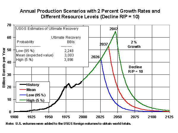 USA proběhl kolem roku 1972. Ve světové produkci se tento vrchol očekává v polovině tohoto století, jak ukazuje tento obrázek. Kliknutí na graf vede k textu celé studie, kterou vypracovalo Americké ministerstvo energetiky. jiné grafy pod hlavičkou "long term world oil supply" ZDE Ropný vrchol neznamená, že ropa zmizí v roce 2050. Znamená to, že ropa, ale i energie z jiných zdrojů, budou dražší než dnes, pokud nenajdeme nová a levnější paliva. Studie ropného zlomu či vrcholu nejsou předpovědí budoucnosti. Co se opravdu stane, to záleží na mnoha nepředvídatelných událostech, jako je technologický pokrok a lidské chování. Proto počítačové modely těchto jevů neříkají 'tohle se stane', ale popisují scénáře, které říkají 'když .. tak' neboli 'za těchto předpokladů lze očekávat tyto důsledky'. Různé scénáře jsou na obr. 2 ukázány křivkami různé barvy. Reakce na scénáře se liší: