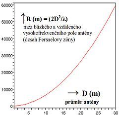 Obr. 14: Závislost dálky Fresnelovy zóny na průměru D antény (vlnová délka 3 cm)